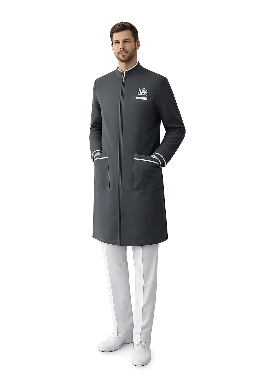 Jaleco masculino com design moderno e funcionalidade para uso em ambientes profissionais e escolares.