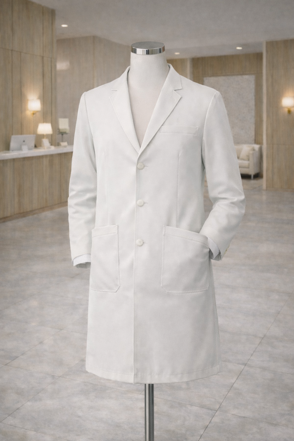 O jaleco é feito com tecido resistente, ideal para uso prolongado sem perder o formato. O design pensado para o público masculino mantém o caimento elegante.